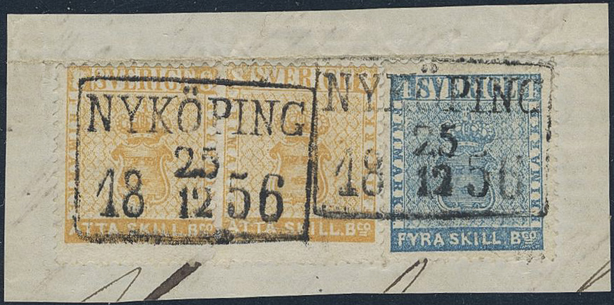 Sweden. Facit 4e, 2e on piece, 4+2×8 sk bco on very fine–superb cut piece cancelled NYKÖPING 25.12.1856. Certificate HOW 3–4, (2,2,4) (4,4).
