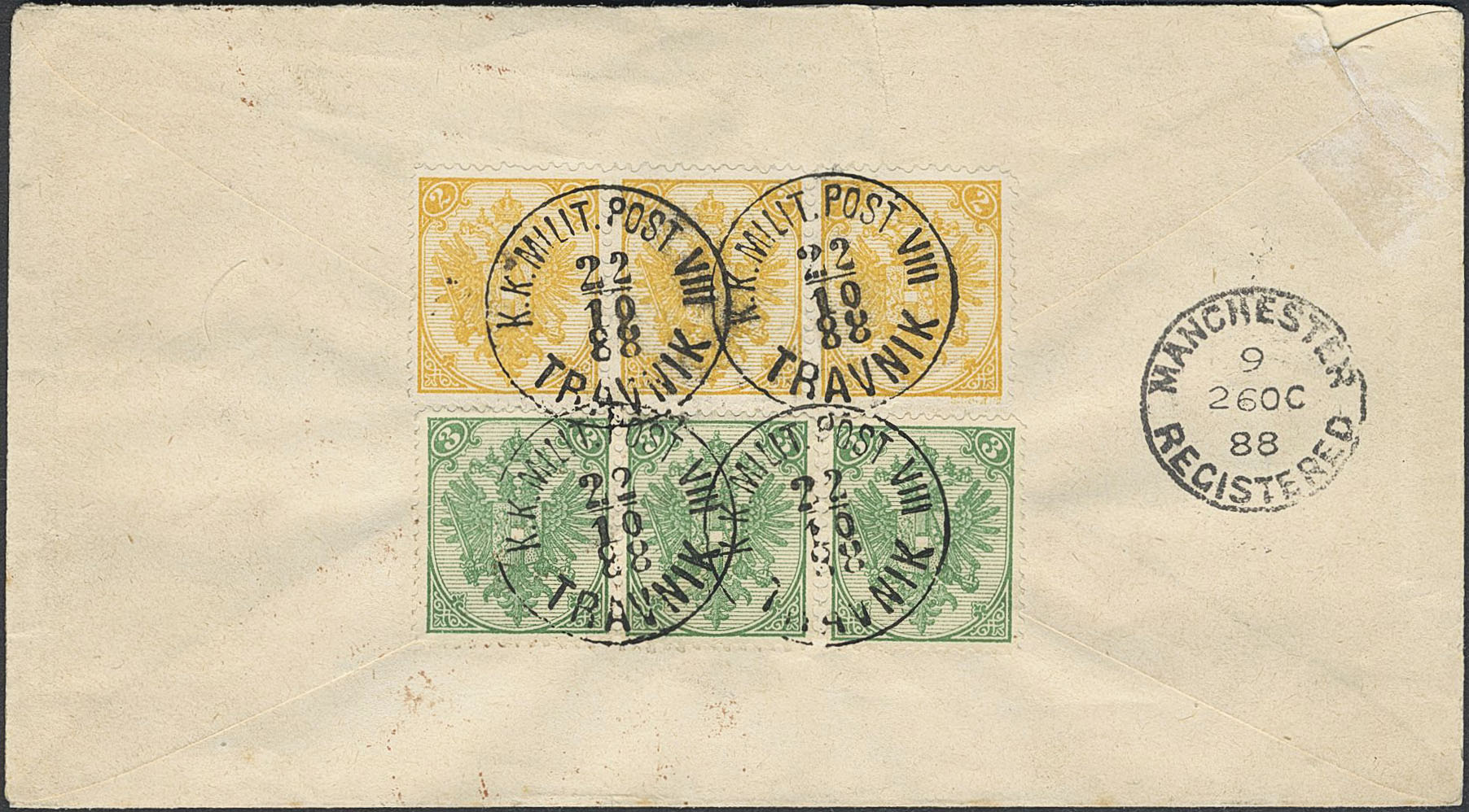 Bosnia and Herzegovina. Michel 2 I, 3 I on cover, 3×1+3×3 Kr on stamped envelope 5 Kr, sent registered from K.K. MILIT. POST VIII TRAVNIK 22.10.88 to MANCHESTER 26.OC.88. The cover is somewhat strengthened and with small traces of mounting, nevertheless a fantastic postal stationery item.