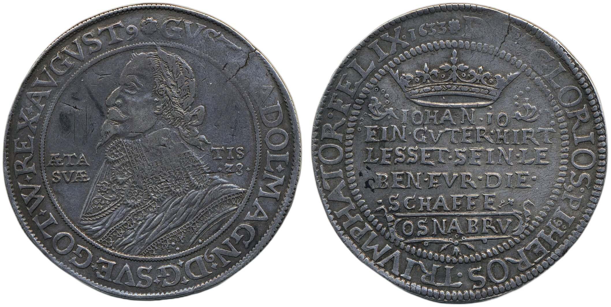 Coins, Sweden, Osnabrück. Gustav II Adolf, SB 4d, 1 taler 1633. 28.42 g. Partly weakly struck, plachet crack, scratches. 1+/01.