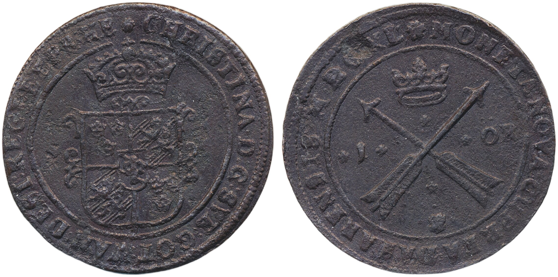 Coins, Sweden. Kristina, SM 116a, 1 öre 1640. 47.50 g. Säter. Corrosion. 1+.