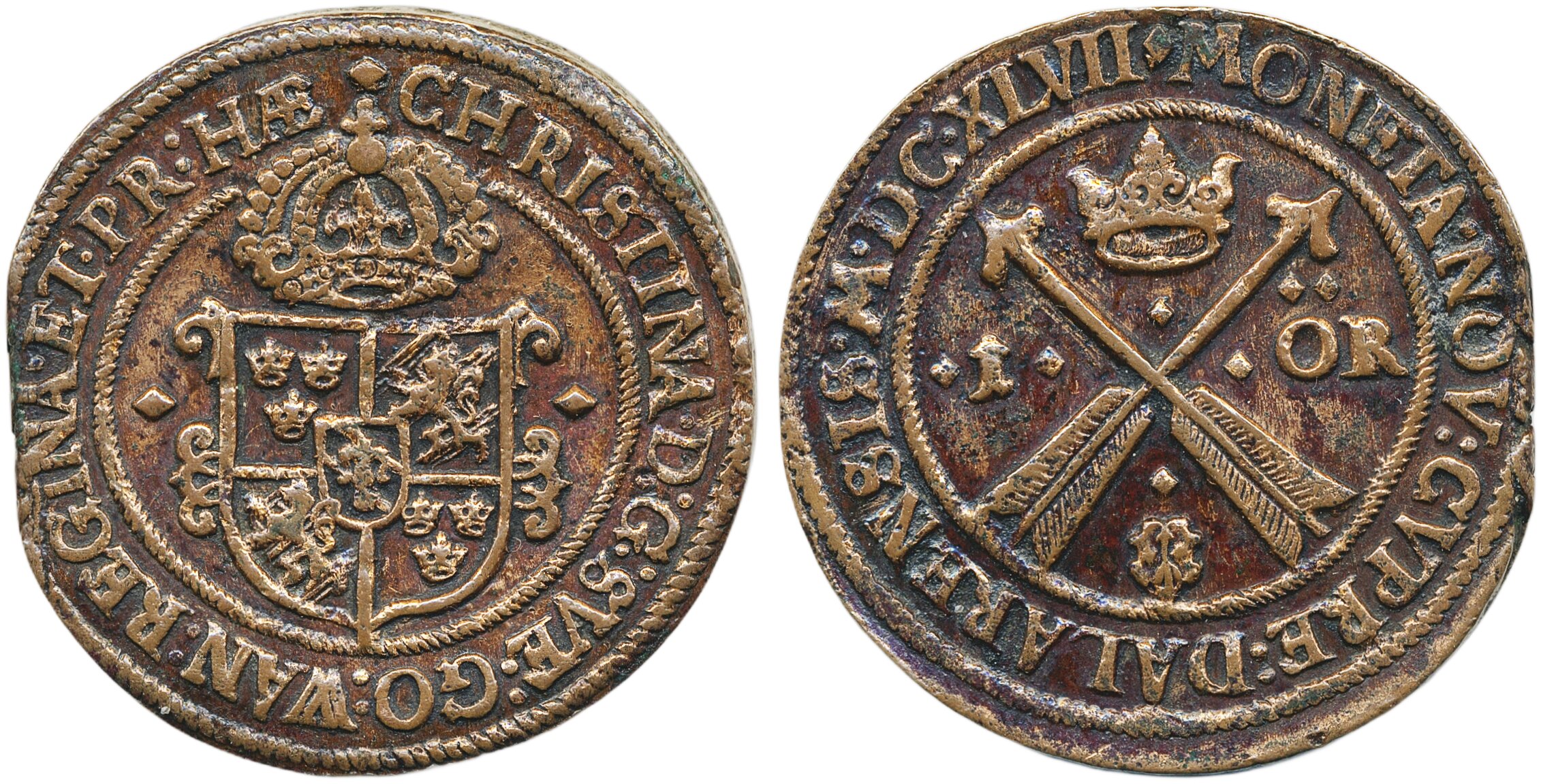 Coins, Sweden. Kristina, SM 121, 1 öre 1647. 52.96 g. Avesta. Laquered. 1+/01.