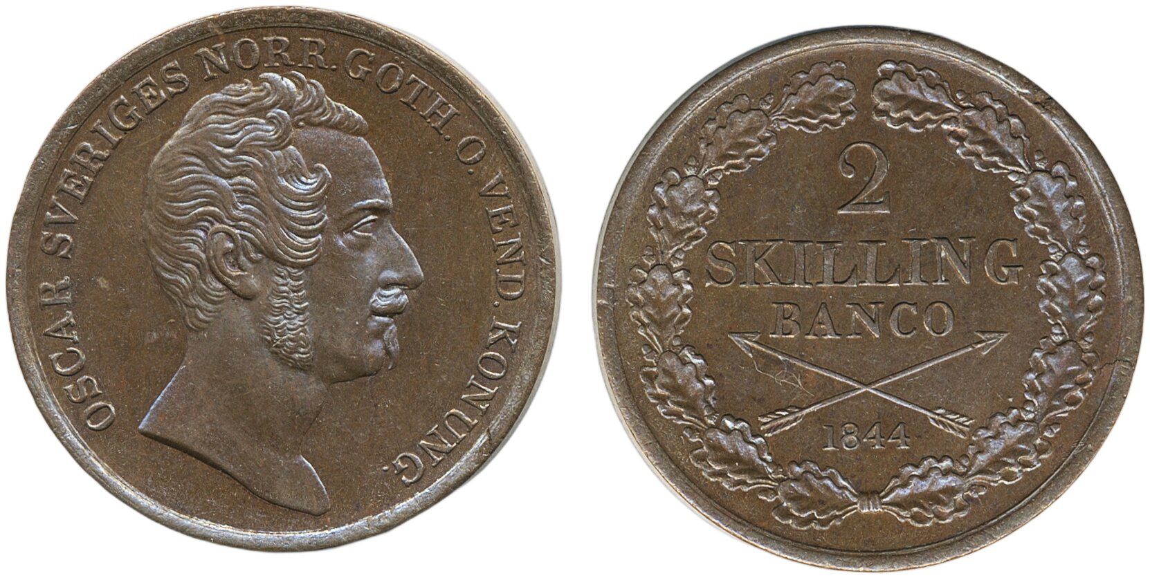 Coins, Sweden. Oskar I, SM 76, 2 skilling banco 1844. Minor planchet flaws. 01.