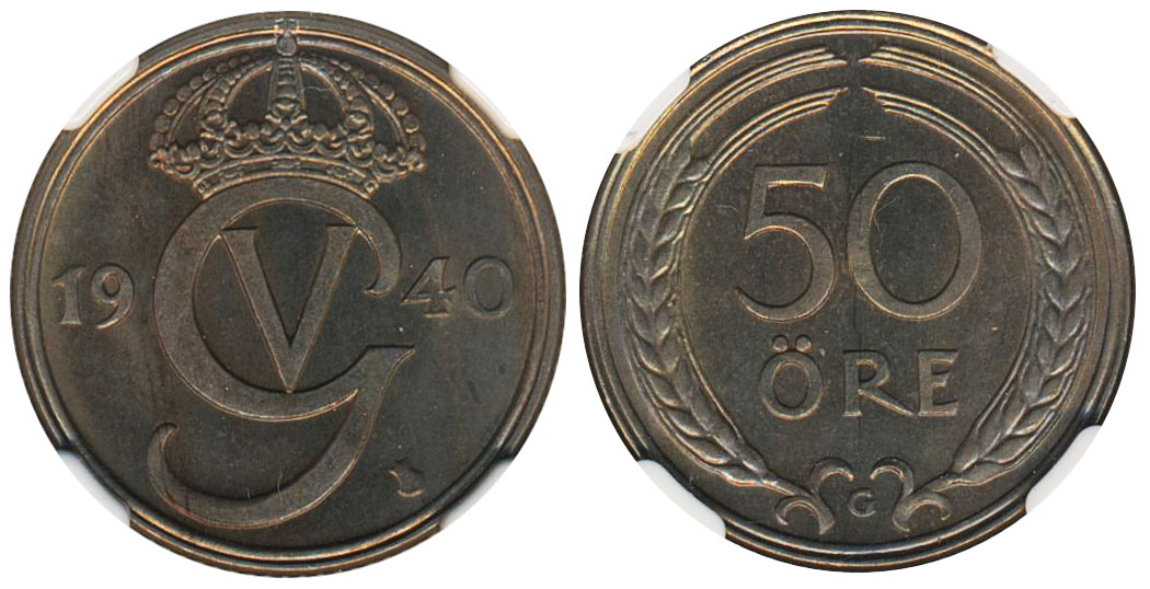 Coins, Sweden. Gustav V, MIS II.4b, 50 öre 1940. Graded by NGC as MS66. Large G, scarce! Single finest graded by NGC. 0. See certification at NGC