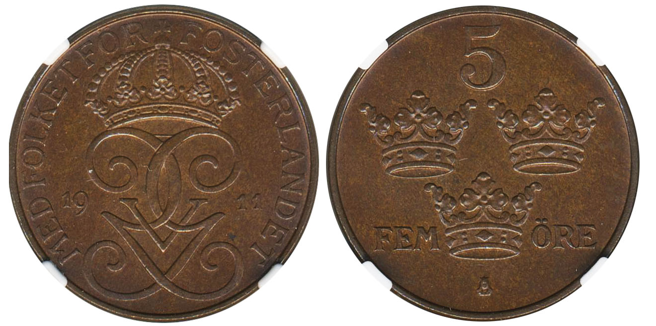 Coins, Sweden. Gustav V, MIS I.3b, 5 öre 1911. Graded by NGC as MS65 BN. Finest graded by NGC. 0. See certification at NGC