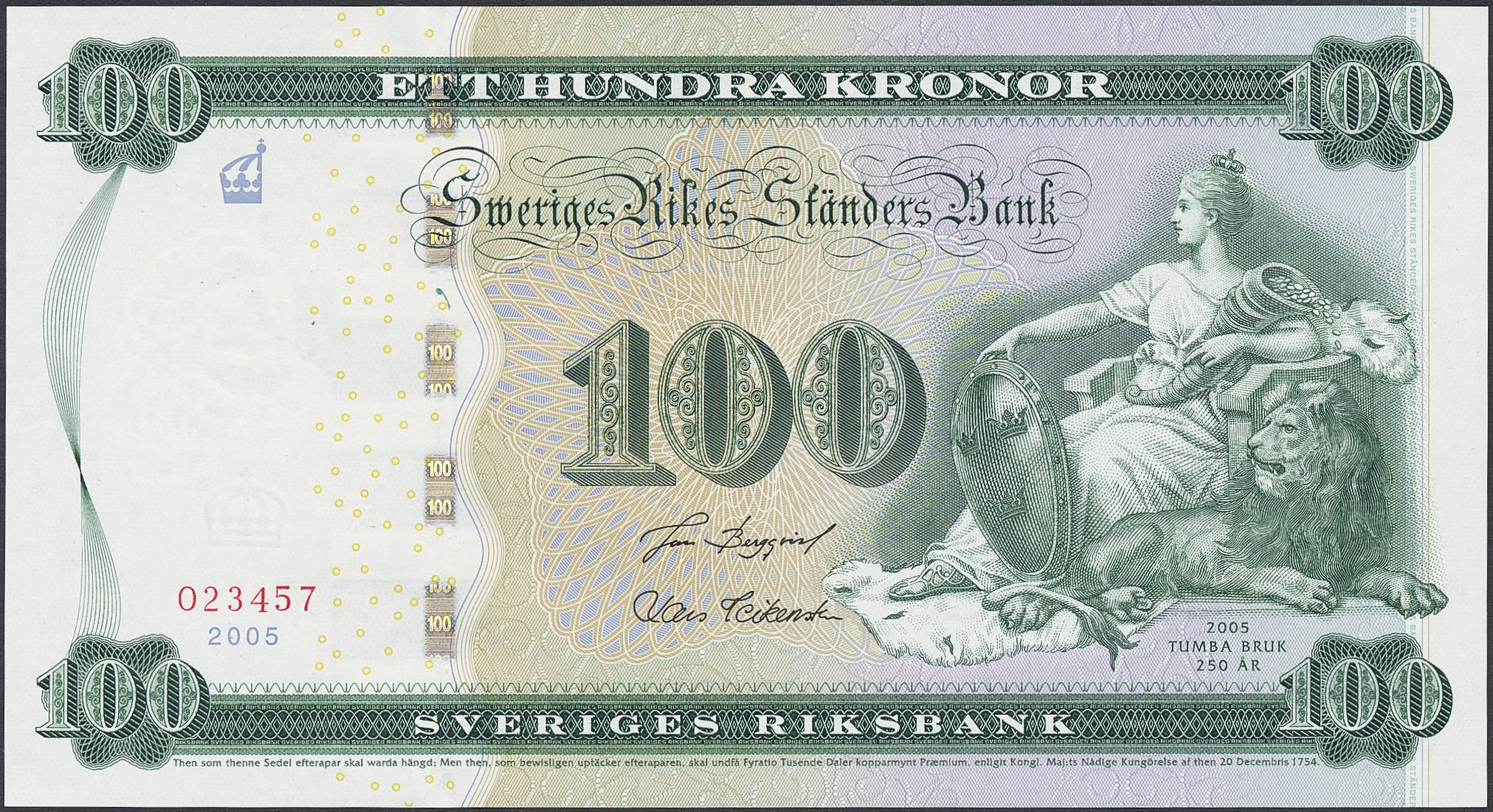 Banknotes, Sweden. SF jub3:1, 100 kronor 2005. No: 023457, in orginal folder. 0.