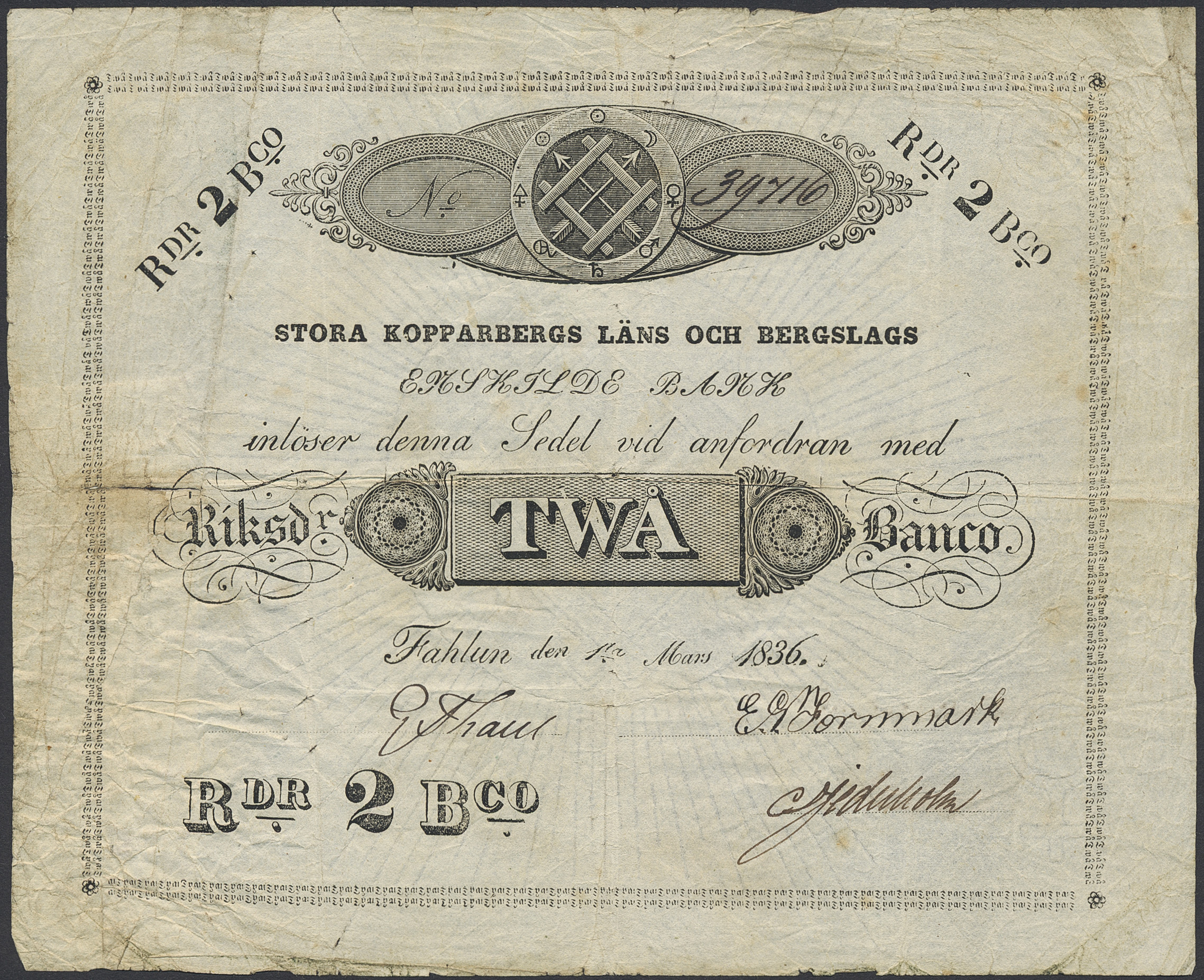 Private banknotes, Sweden. Plat 4, 2 riksdaler banco 1836. No 39716. Tear at left, somewhat reinforced. Scarce note. Pick S521a. 1.