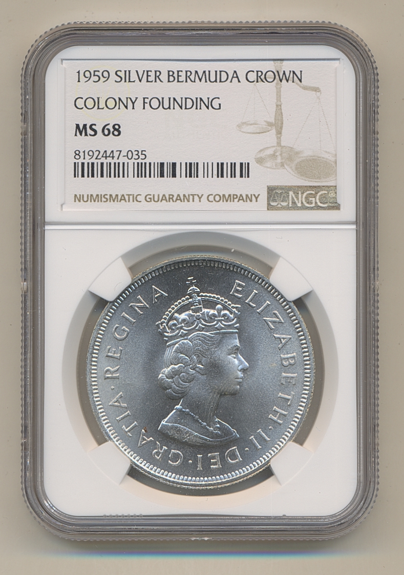 Coins, Bermuda. Queen Elizabeth II (1952-2023), KM 13, 1 crown 1959. Graded by NGC as MS68. UNC. See certification at NGC