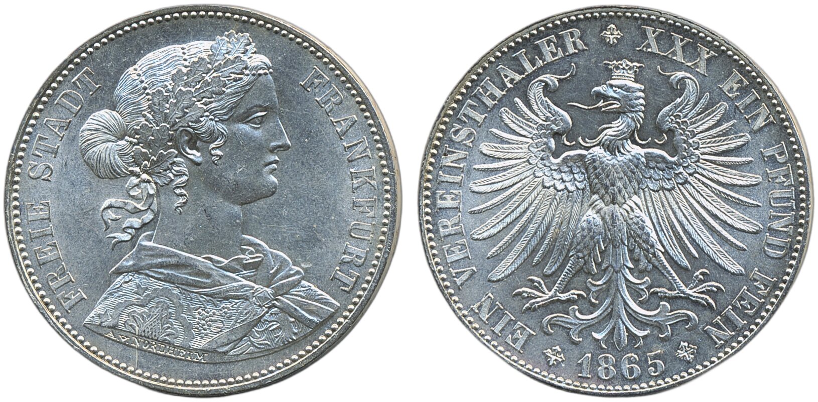 Coins, Germany, Frankfurt. KM 370, 1 thaler 1865. Lustrous example. Dav. 652. XF-UNC.