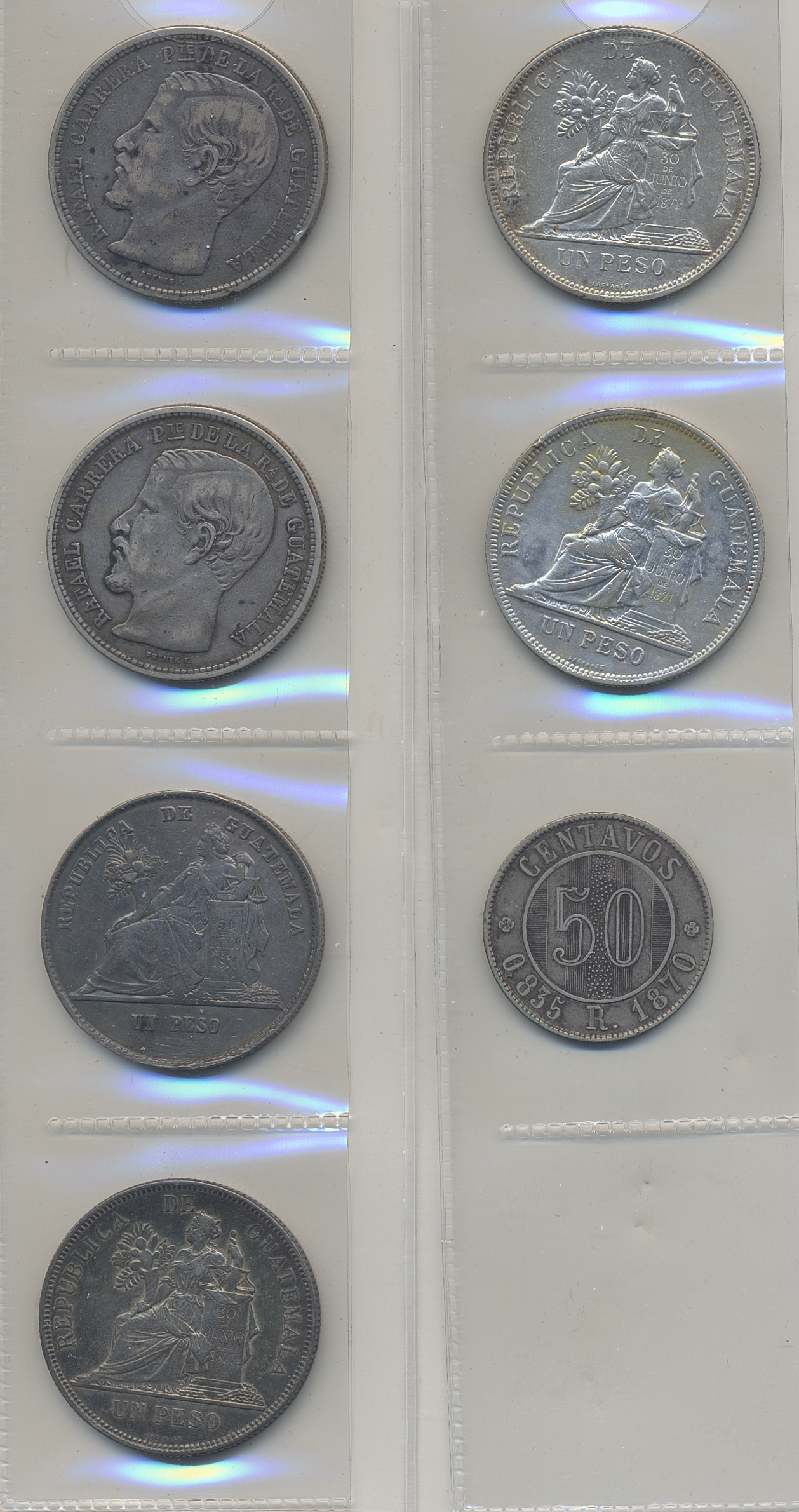 Coins, Guatemala. Group of silver pesos 1863, 1864, 1873, 1894, 1895, 1896. Some cleaned and 1873 with mount removed. Also a 50 centavos 1870. Please inspect! F/VF-VF/XF.