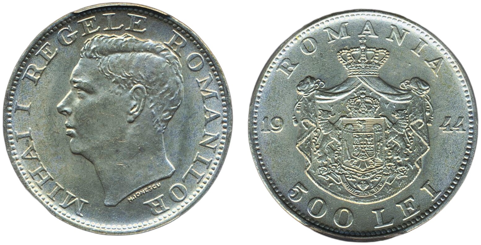 Coins, Romania. KM 65, 500 lei 1944. Graded by PCGS as MS63. XF-UNC.