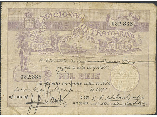 Banknotes, Mozambique, Lourenço Marques. KM 16, 1000 reis 1897. Banco Nacional Ultramarino, Mozambique, Lisbon, 2 Januar..