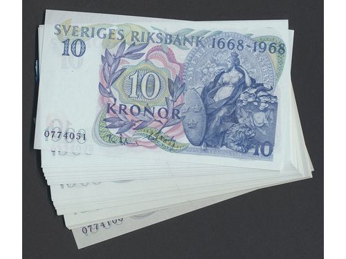 Banknotes, Sweden. SF Jub2:1, 10 kronor 1968. Three banknotes in sequences, No: 0100826–0100828. 0. Show less