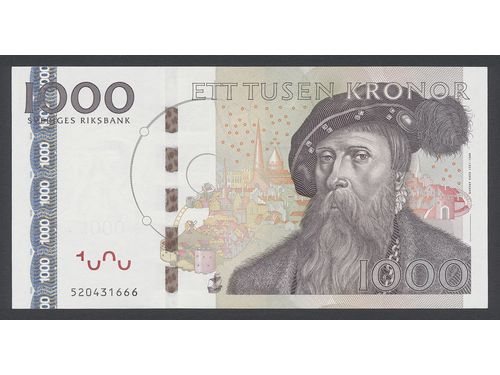 Banknotes, Sweden. SF X11:6, 1000 kronor 1992. Three banknotes, No: 2341770212, 2301413565 and 2291645397. 01/0. Show less