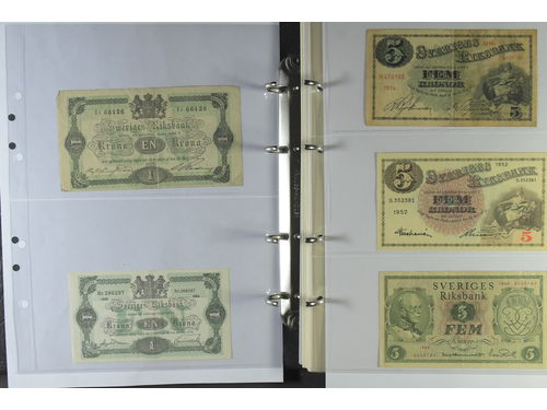 Banknotes, Sweden. One album with 28 banknotes, 1914–2006, 1 krona–100 kronor, mixed quality.