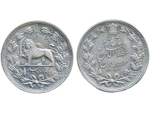 Coins, Iran. Muzaffar al-Din Shah (1896-1907), KM 976, 5000 dinars (5 kran) AH1320 (1902). Lustrous example. XF.