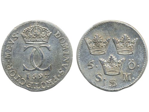 Coins, Sweden. Karl XI, SM 154, 2 mark 1693. 10.03 g. Stockholm. Planchet flaw at rim. Reverse with some small scratches. 1+.