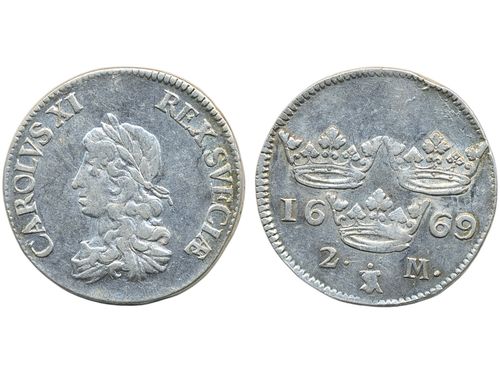 Coins, Sweden. Karl XI, SM 124a, 2 mark 1669. 10.17 g. Stockholm. Moneyer First. Göhle 575. Edge nick. 1+/01.