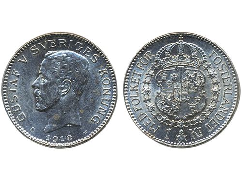 Coins, Sweden. Gustav V, MIS I.7, 1 krona 1918. Scarce key date. A couple of minor dull spots. 01.