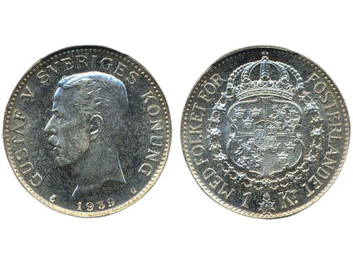 Coins, Sweden. Gustav V, MIS I.25d, 1 krona 1939. Graded by NGC as MS64, broken G. SM 58c. 01/0. See certification at NGC