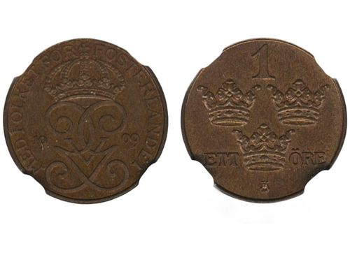 Coins, Sweden. Gustav V, MIS I.1e, 1 öre 1909. Large cross. Graded by NGC as MS64 BN. 01/0. See certification at NGC