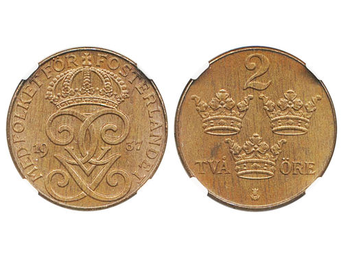 Coins, Sweden. Gustav V, MIS I.27, 2 öre 1938. Graded by NGC as MS66 BN. Finest graded by NGC. 0. See certification at NGC