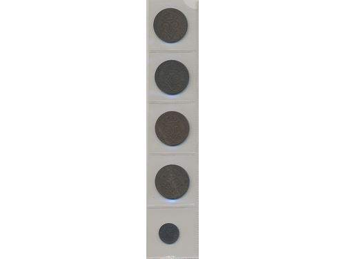 Coins, Sweden. Gustav V, 5 öre 1910 (two pcs), 5 öre 1927 (two pcs) and 1 öre 1914 open 4. In total five pcs. Please inspect! Show less