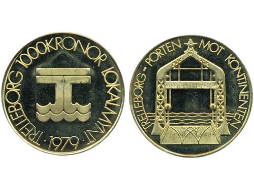Coins, Sweden. Carl XVI Gustaf, 1000 kronor 1979. 17.96 g. 18 carat gold, local coin Trelleborg. 0. Show less