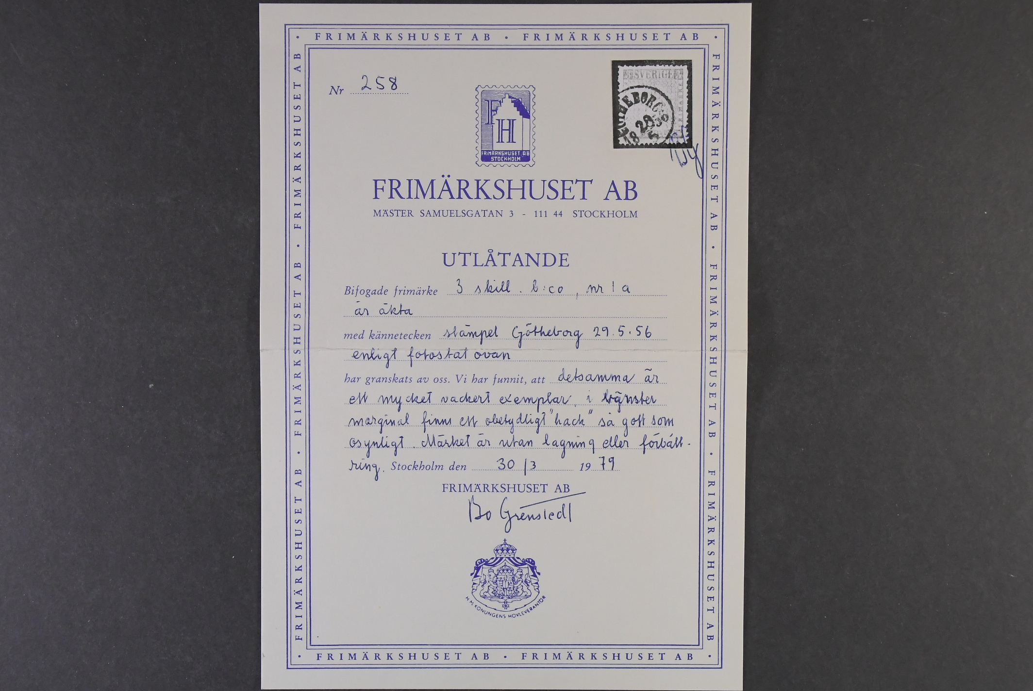 Sweden. Facit 1a used, 3 skill light bluish green. Left marg with minimal notch, otherwise a very beauful copy cancelled GÖTHEBORG 29.5.1856. Cert. Grenstedt. SEK 50000