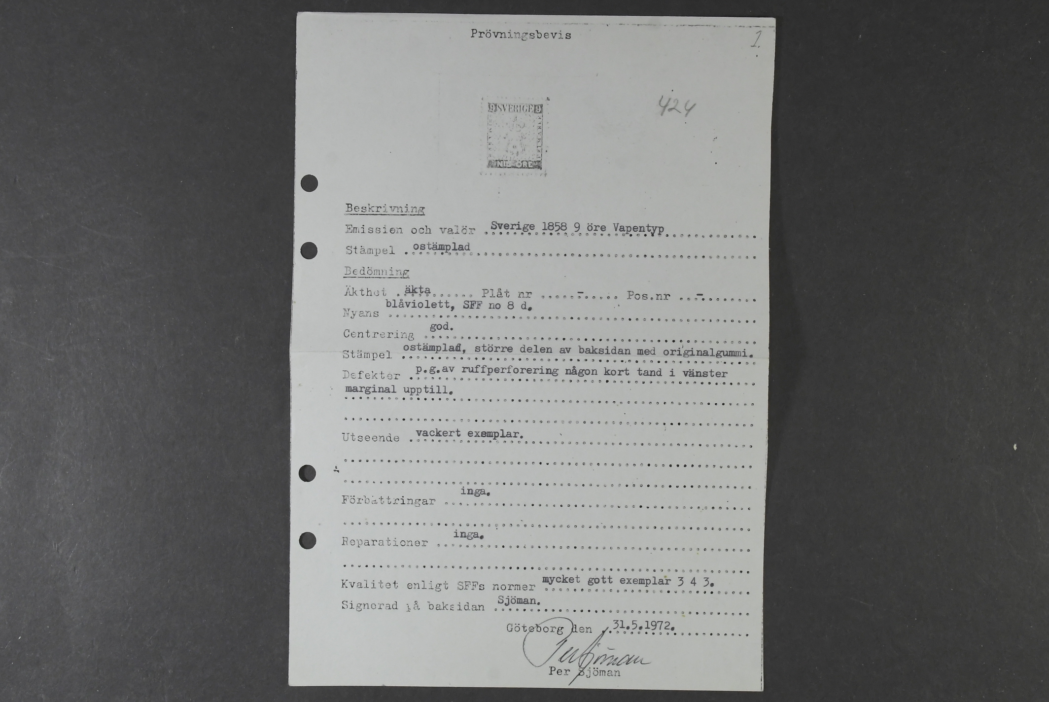 Sweden. Facit 8d ★, 9 öre blue-violet. Rough perforation. Certificate Sjöman 3 4 3 (1972).
