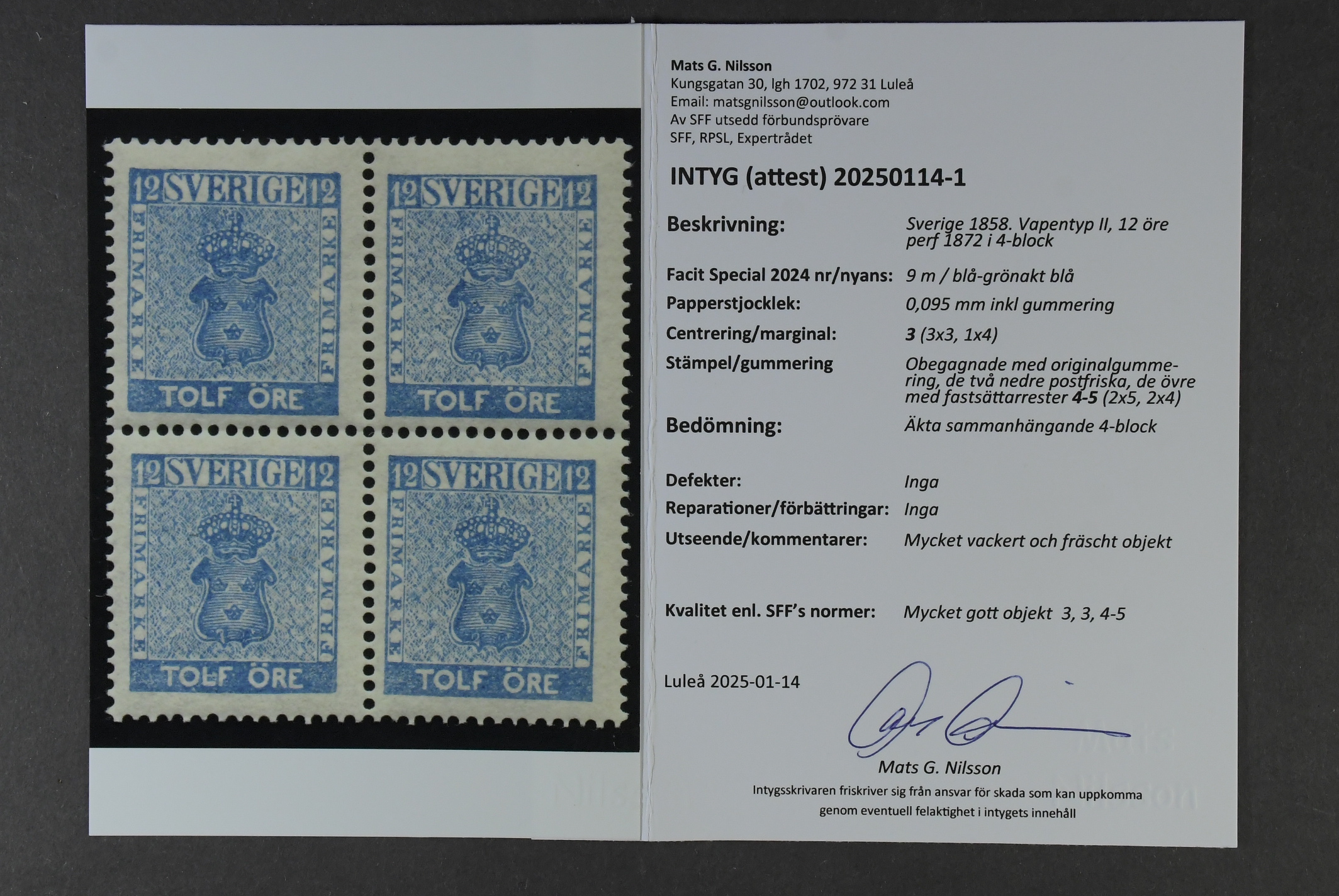 Sweden. Facit 9m ★★/★, 12 öre blue-greenish blue. Very fine and fresh block of four with two stamps MNH. Certificate M. Nilsson 3, 3, 4–5 (2025). Ex. Contenta. SEK 21900