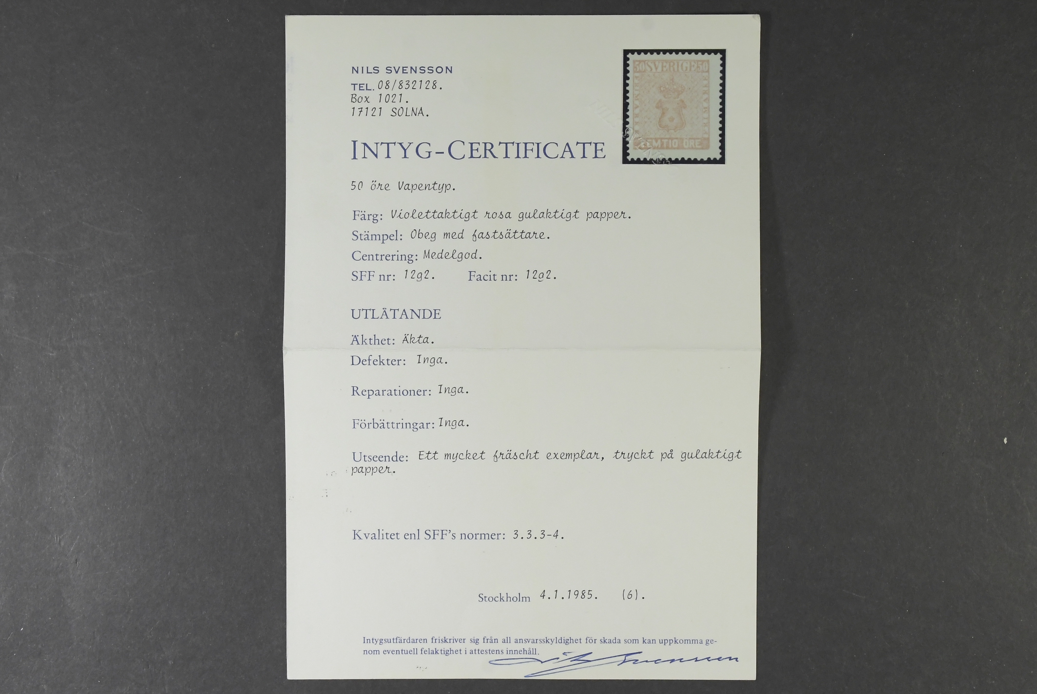 Sweden. Facit 12g2 ★, 50 öre violet-tinged rose, perforation of 1865. Very fine example. Certificate NS 3.3.3–4 (1985).