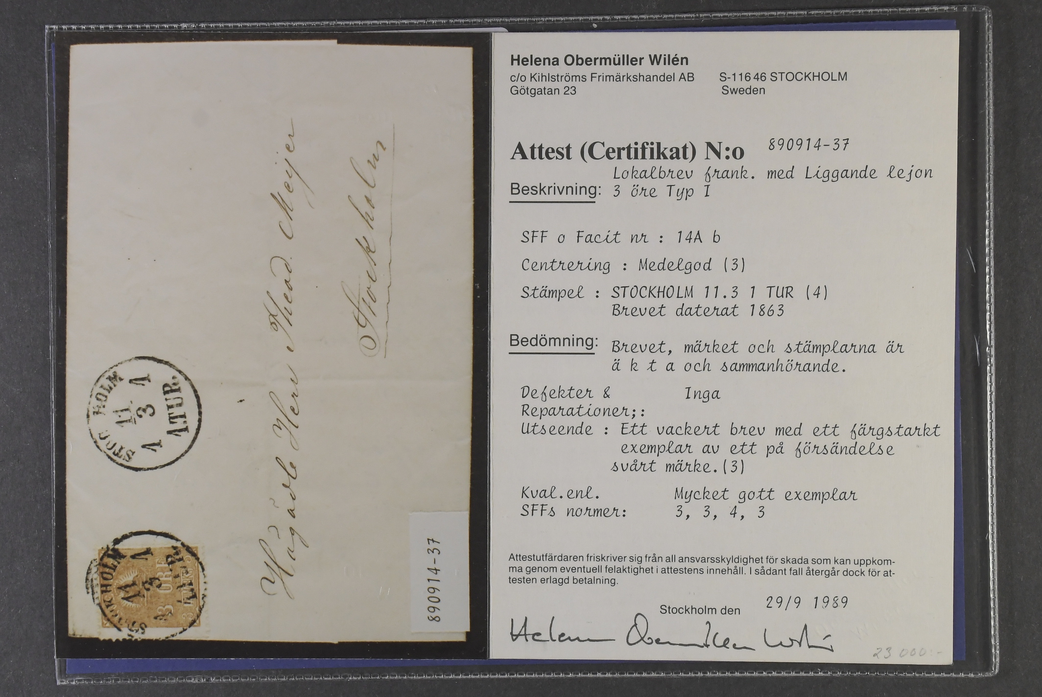 Sweden. Facit 14Ab on cover, 3 öre yellowish brown, type I. Local cover cancelled STOCKHOLM 1.TUR 11.3. Certificate HOW 3, 3, 4, 3 (1989).