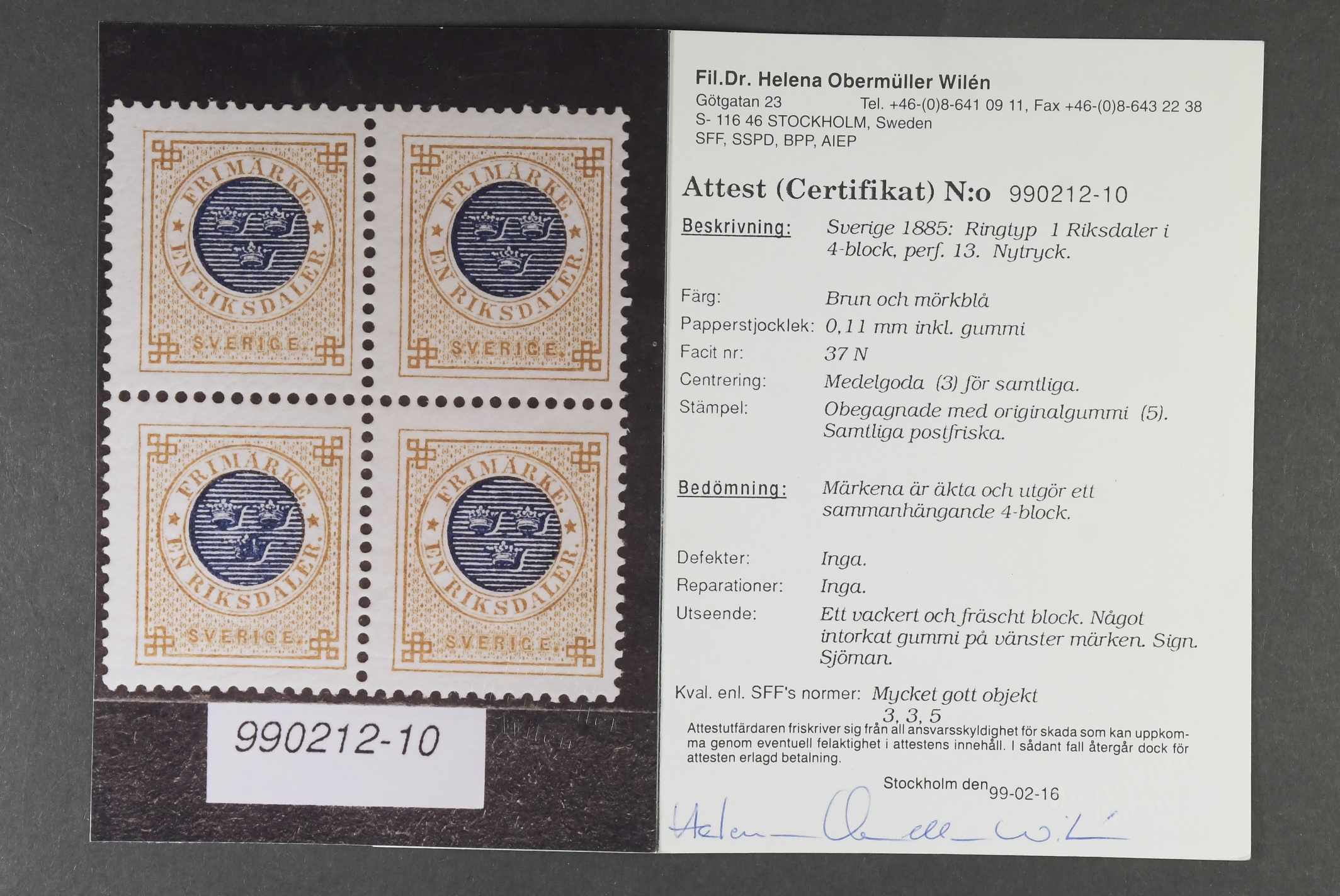 Sweden. Facit 37N ★★, 1 Riksdaler brown/dark blue reprint in very fine block of four. Signed Sjöman. Certificate HOW 3, 3, 5 (1999). Ex. Contenta.