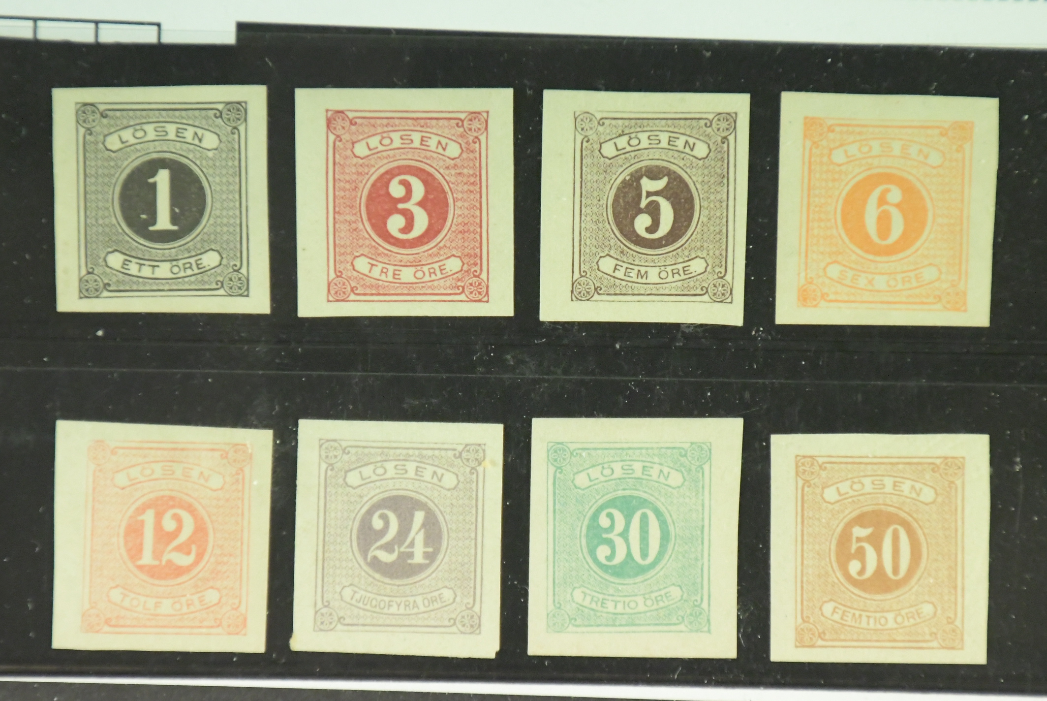Sweden. Postage due Facit L11–15, 17–19v1 ★, 1–12 and 24–50 öre imperforated short SET (8). SEK 12000
