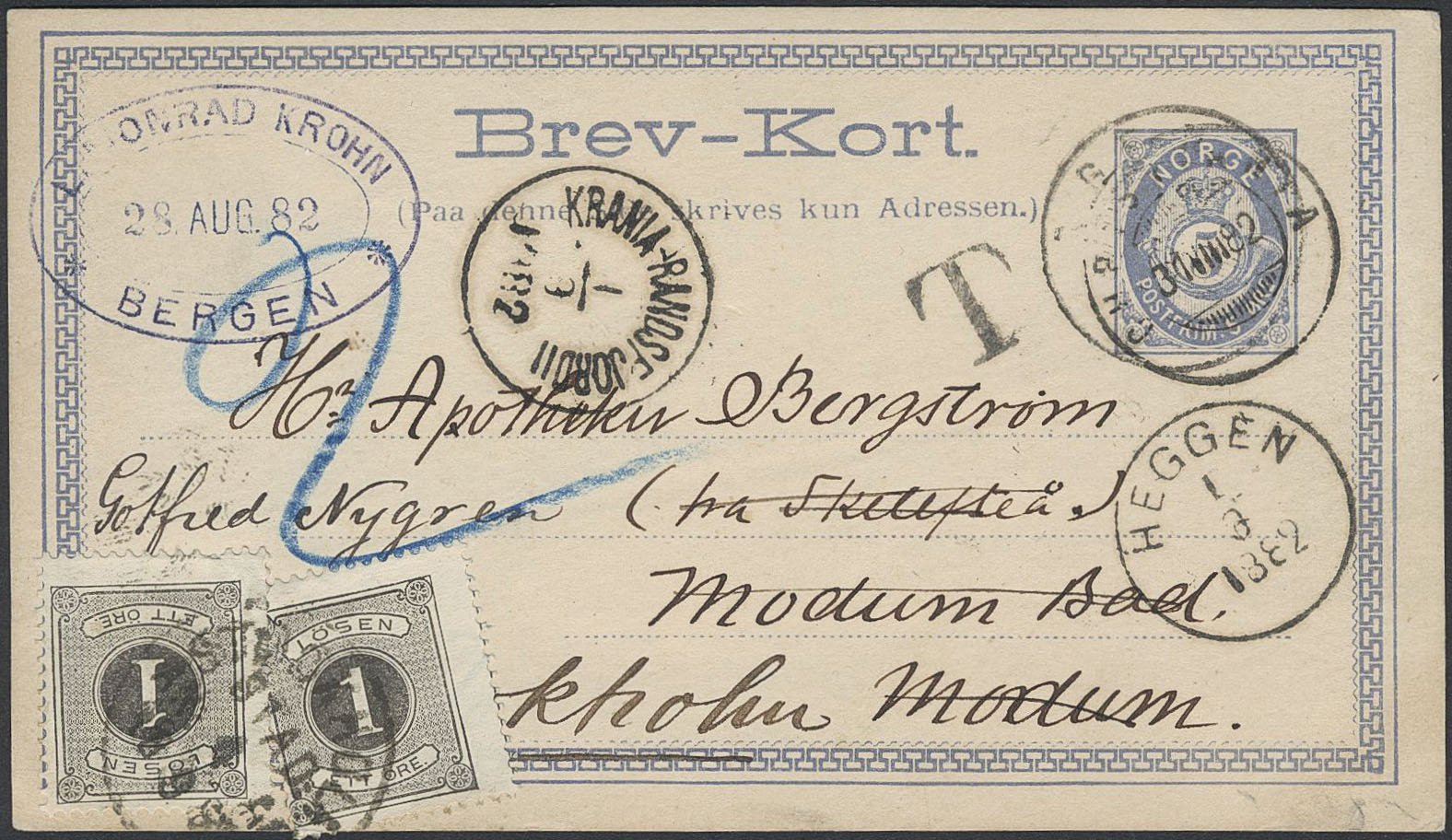 Sweden. Postage due Facit L11a1 on cover, 2×1 öre as postage due on Norwegian postal card 5 øre sent from BERGEN 28.8.1882 to Modum, then forwarded insufficently prepaid to STOCKHOLM STADEN 4.9.1882. Very nice exhibition item. Ex. Beckeman.