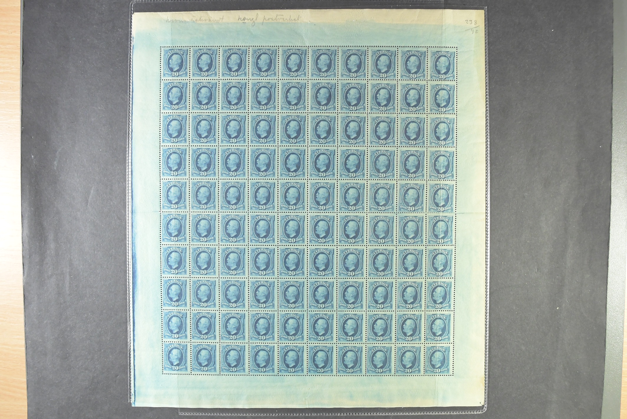 Sweden. Facit 56 ★★, 1891 Oscar II 20 öre blue in sheet of 100 stamps. Most good quality and good centering. Ex. Contenta. SEK 70000