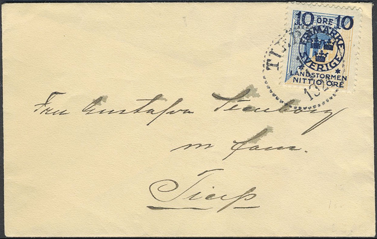 Sweden. Facit 124a on cover, 1916 Landstorm II 10+NITTIO / 1 kr blue/greyish brown. Local cover cancelled TIERP 1.1.1921. Late usage but genuine cover. Opinion by Lorentzon (2025).
