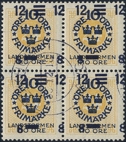 Sweden. Facit 133v1 used, 1916 Landstorm III 12+8 / 10+TIO / 24 öre yellow sharply misplaced surcharge. Cancelled STOCKHOLM 30.12.18.