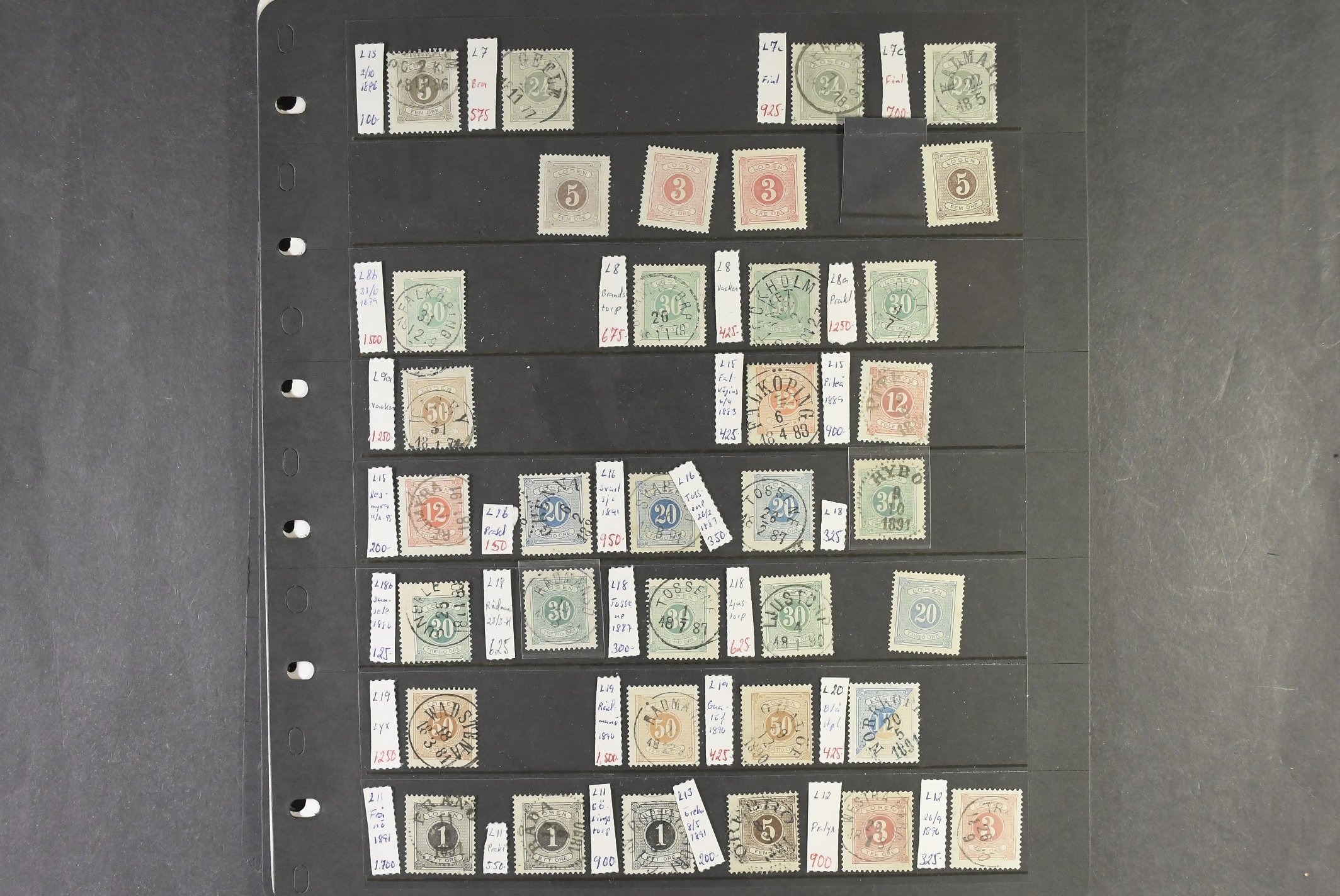 Sweden. Collection ★★/★/⊙ POSTAGE DUES on visir leaves. Duplicate lot perf. 14 and 13 incl. shades, cancellations, blocks, etc. Please inspect. Ex. Contenta. Somewhat mixed quality.