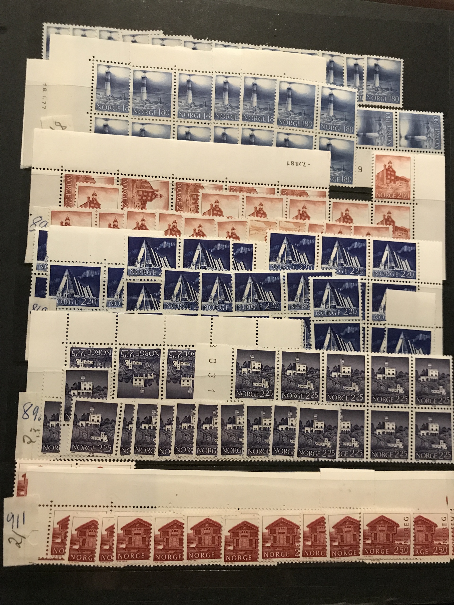 Norway. ★★. Stock 1978–1989 in thick visir binder incl. many blocks of four and other units. Face value approx. 15900. Please see a selection of scans at www.philea.se. Excellent quality.