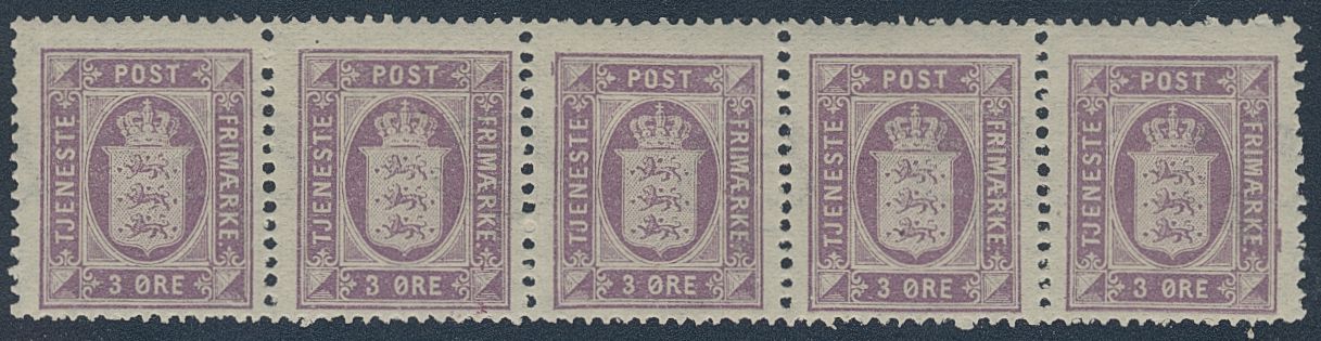 Denmark. Official Facit Tj6 ★★, 1875 Coat-of-Arms 3 øre lilac, watermark crown, perf 14 × 13½. Inverted wm, strip of five, a bit rough perfs. SEK 2500 for * much more for **