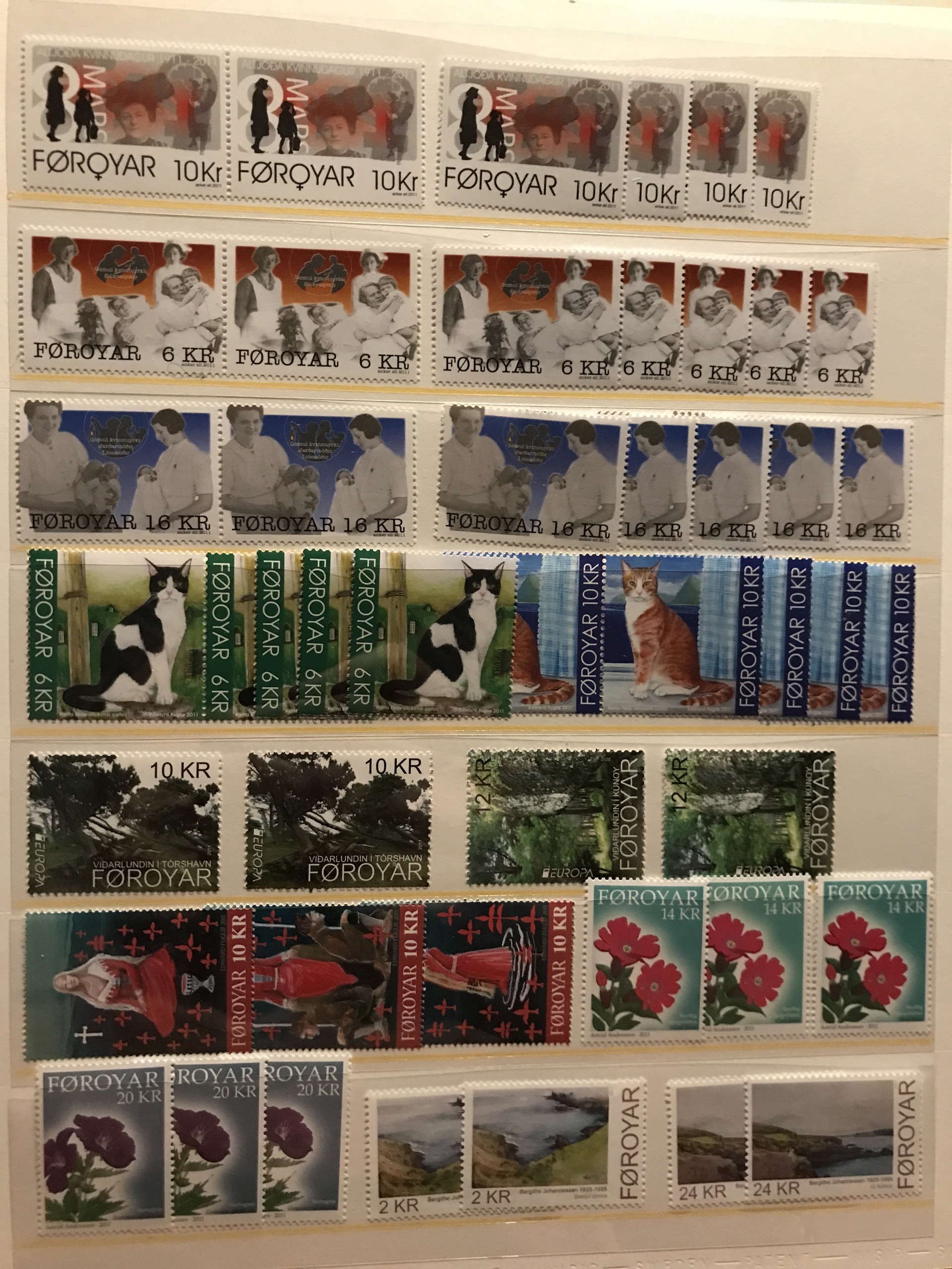 The Faroes. ★★. Big stock 1975–2018 in two thick visir binders incl. e.g. about 290 mini sheets, some blocks-of four and other units. Face value approx. 44500. Please see a selection of scans at www.philea.se. Excellent quality. Approx. 6 kg.
