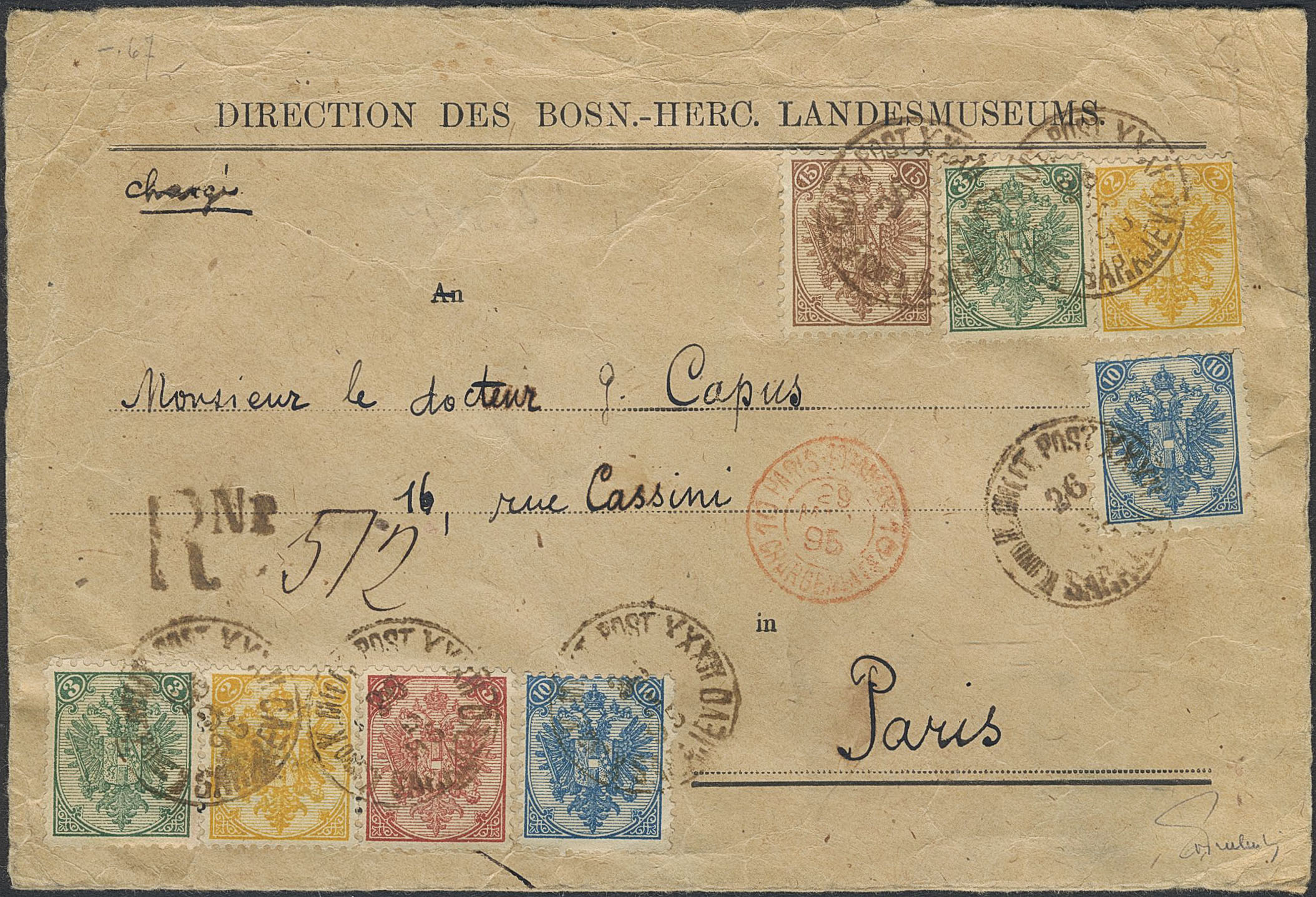 Bosnia and Herzegovina. Michel 2–6 I on cover, 2×2+2×3+5+2×10+15 Kr as nice five colour franking on rare registered cover front sent from K and K MILIT. POST XXXII SARAJEVO 26.3.95 to France. Red arrival pmk PARIS 29.MARS.95 on the front. Letter slightly creased. Beautiful and rare show piece. Certificate Ferchenbauer (1995).