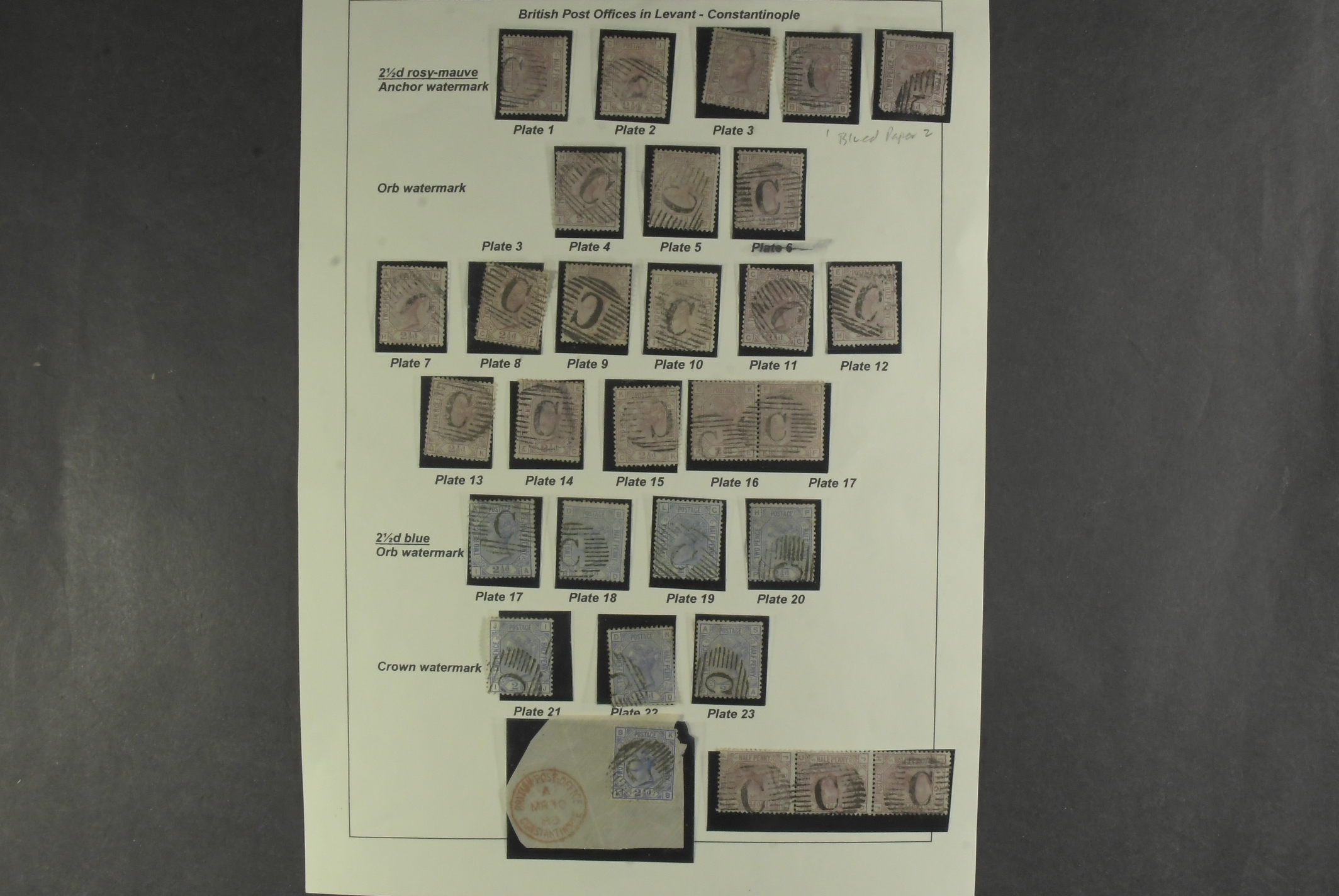 Britain. Used. Used in the Levant – an extraordinary page, not just because the quality is tip-top throughout, it also has methodically got all the plates for the 2½ d rose mauve from plate 1–16 including blue papers plus the 2½ d blue from plate 17–23 – this would be an achievement in GB, yet used abroad in Constantinople.