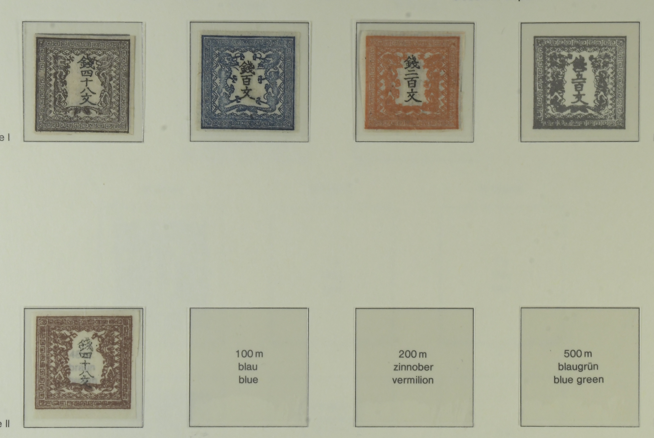 Japan. Collection mostly ★★ 1871–1951 in Leuchtturm album with stamp mounts. Quite sparsely filled (especially until 1937), however with many 'important' items as mini sheets. Fine quality. (>400)