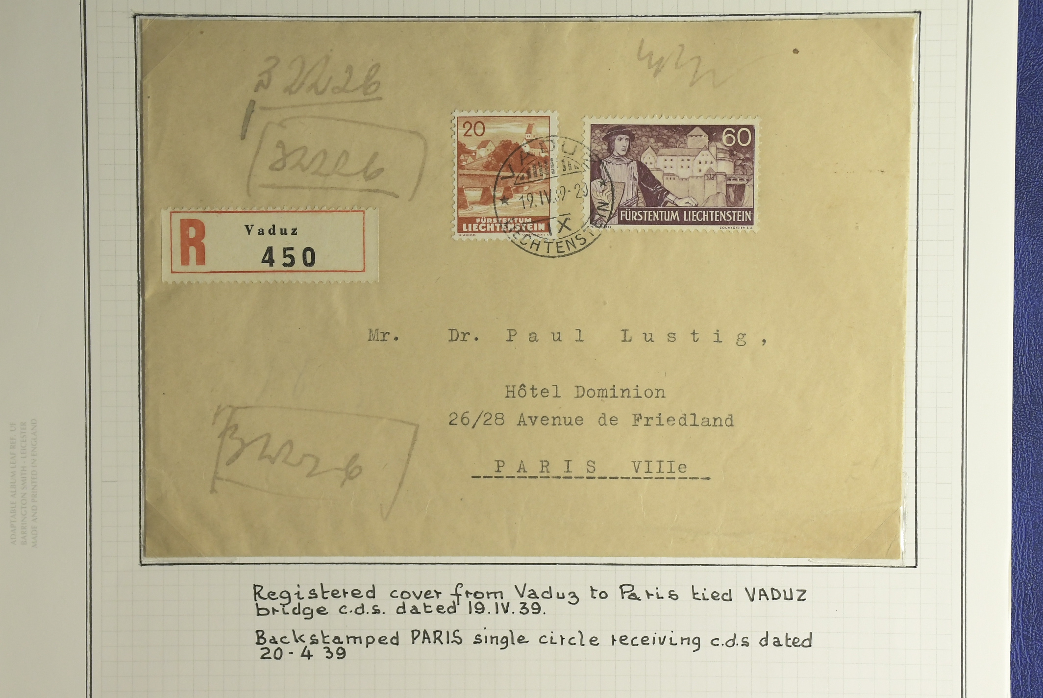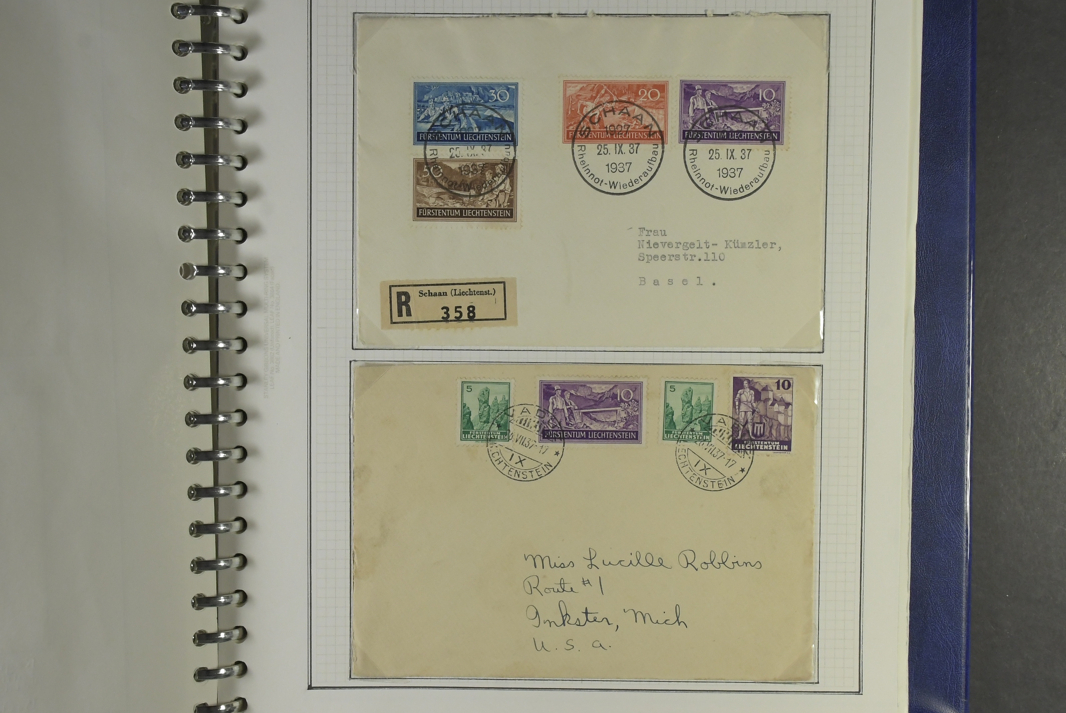 Liechtenstein. Collection covers 1920–1940 in album. A stunning, unusual COVER collection of many scarce items from this principiality. Many better frankings incl. express, registered, air mail, etc., also many better stamps on the covers. Also some stamps included. Very high value! The entire lot is presented at www.philea.se. Fine quality.