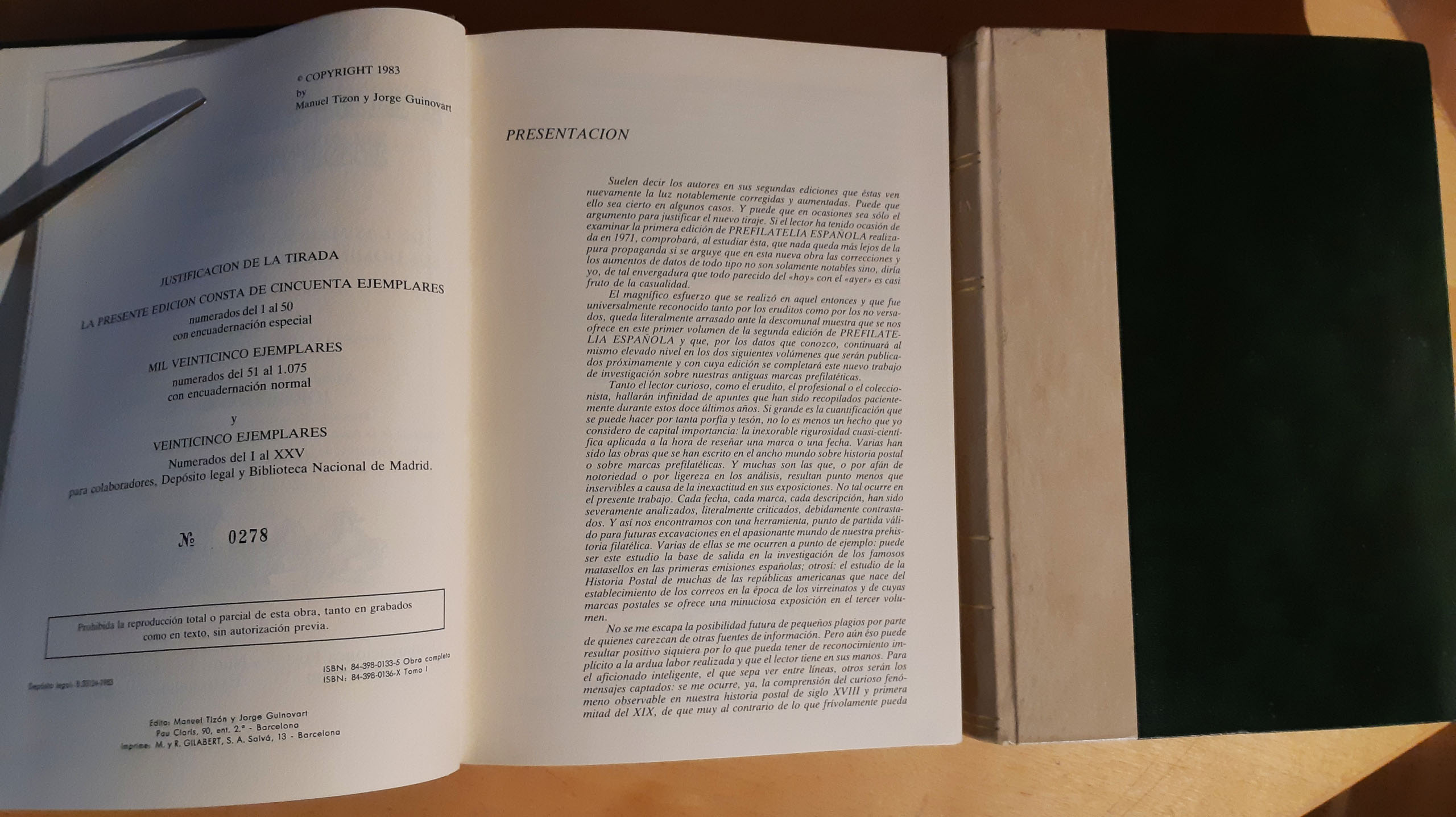 Literature. Guinovart, J., Tizon, M., 'Prefilatelia Española Nuevo Estudio de las Marcas Postales de España y sus Dominios de Indias, Siglos XVIII y XIX', 1971, first edition, two volumes, hardcover, 989 pp., limited edition, No. 278 of 1000 copies. Excellent work of Spanish pre-adhesive postmarks.
