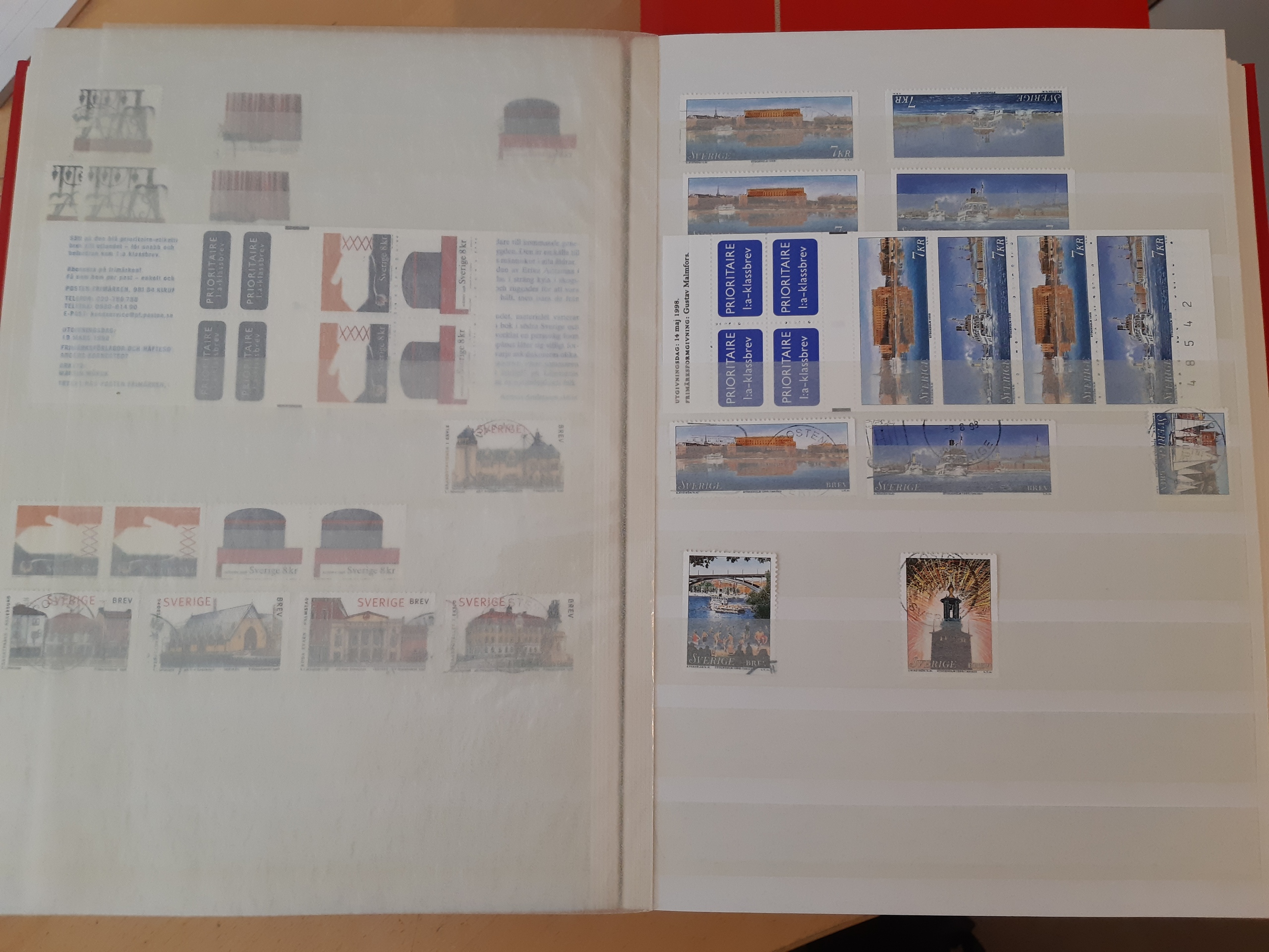Sweden. Collection/accumulation ★★/⊙ mostly 1960s–2000 in four large stockbooks in box. Face value about 6000 + many used. Approx. 8 kg. (1000s)