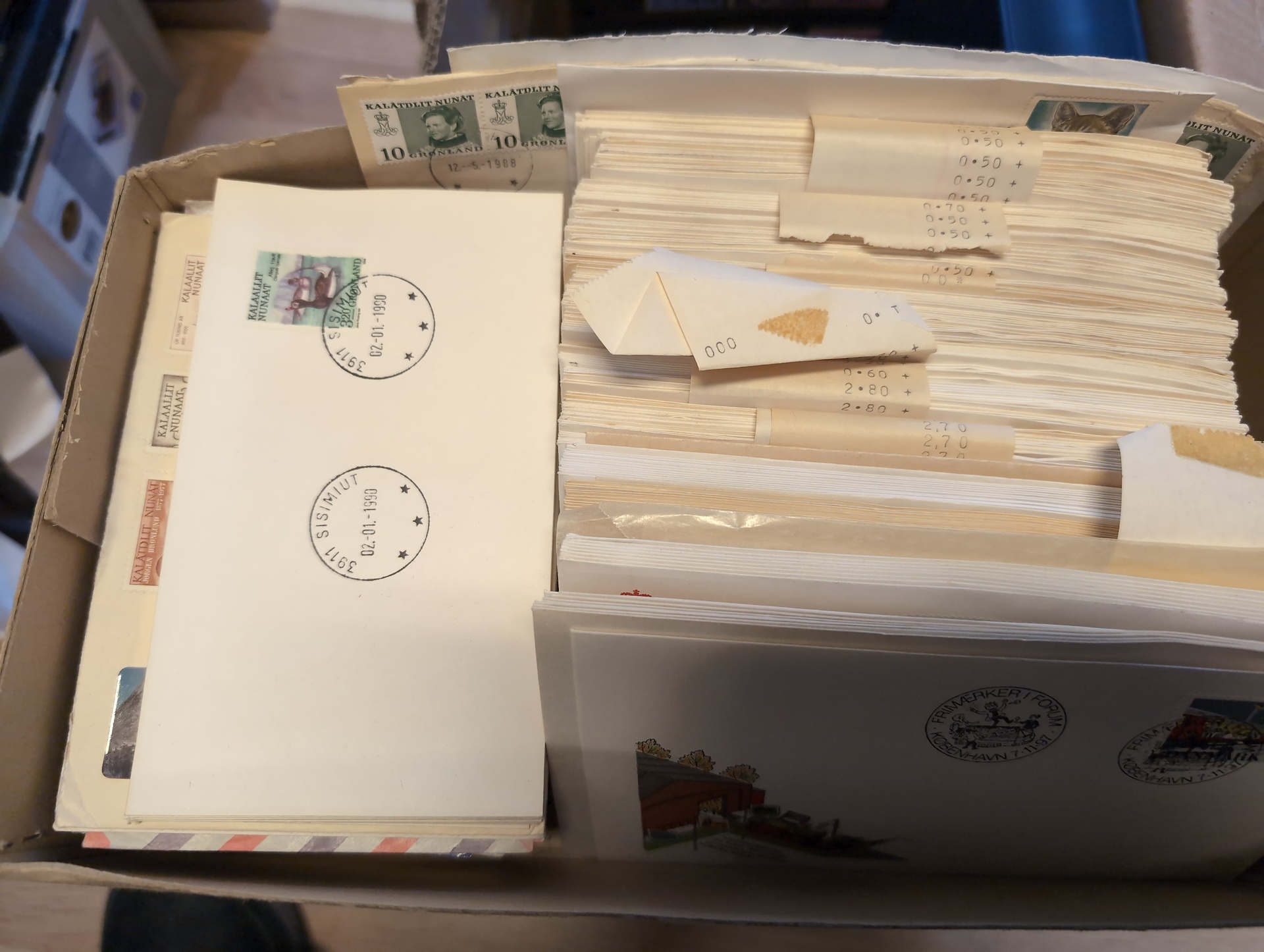 ALL WORLD. Accumulation ★★/★/⊙ 1900–1990s in box. Visir album Brittain and Ireland, Box wth Greenland and Denmark FDCs, Box with glassines duplicates. Stockbook with some a bit better stamps and sets. Leaves with San Marino and some other countries incl. some a little bit better. Mostly fine quality. Approx. 7 kg. (1000s)