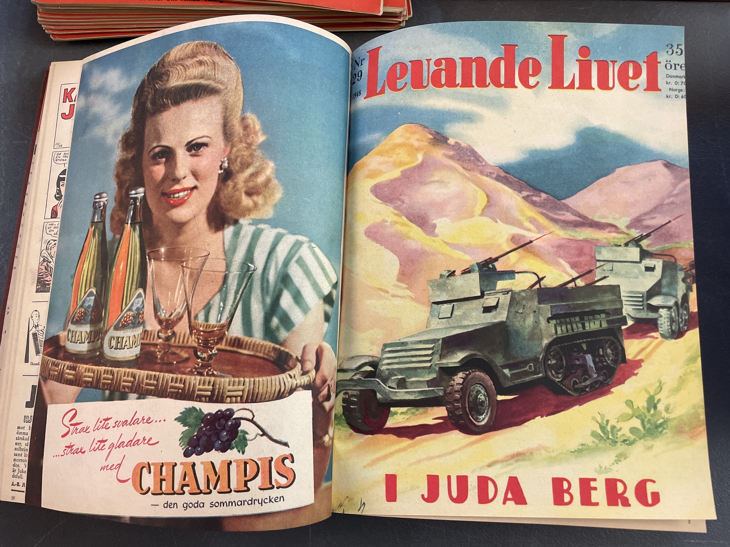 Comics, Sweden. The magazines 'Rekord-Magasinet med All-sport' and 'Levande livet' from 1948 and 1949. Unfortunately they are not in mint condition but nevertheless soon 80 years old. In total six volumes. Approx. 16 kg.